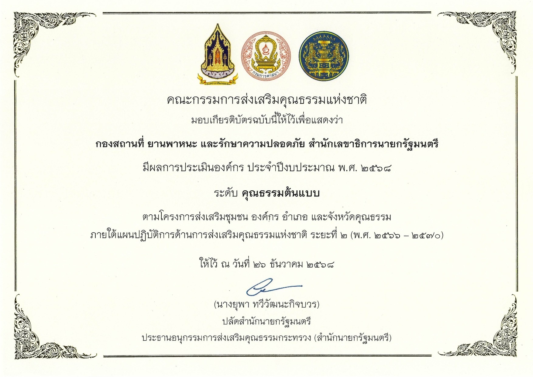เกียรติบัตรจากคณะกรรมการส่งเสริมคุณธรรมแห่งชาติ ประจำปีงบประมาณ พ.ศ. ๒๕๖๘