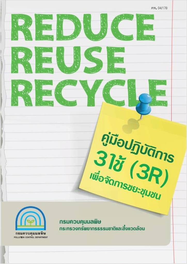 กรมควบคุมมลพิษ กระทรวงทรัพยากรธรรมชาติและสิ่งแวดล้อม ออกคู่มือปฏิบัติการ 3R Reduce Reuse Recycle สำหรับใช้จัดการขยะชุมชน เพื่อให้ความรู้และแนวทางปฏิบัติในการลดขยะมูลฝอย และนำขยะบางส่วนมาแปรรูปใหม่ ให้เกิดประโยชน์และสร้างรายได้ให้กับครอบครัว ทั้งนี้ นอกจากประชาชนทั่วไปจะสามารถลดขยะมูลฝอยได้ด้วยตัวเองแล้ว ขยะเหล่านี้สามารถทำเป็นธุรกิจสร้างรายได้เพิ่มขึ้น และขยะที่นำไปใช้ประโยชน์ในรูปแบบของ 3R (Reduce Reuse Recycle) ทั้งหมดแล้ว จะถูกเก็บรวบรวมมากำจัด ณ สถานที่กำจัดขยะ โดยใช้รูปแบบการกำจัดที่เหมาะสมกับปริมาณและองค์ประกอบของขยะที่เกิดขึ้นในพื้นที่ โดยสามารถอ่านคำแนะนำและวิธีปฏิบัติ เพิ่มเติมได้ที่หัวข้อ E-BOOK www.spm.thaigov.go.th