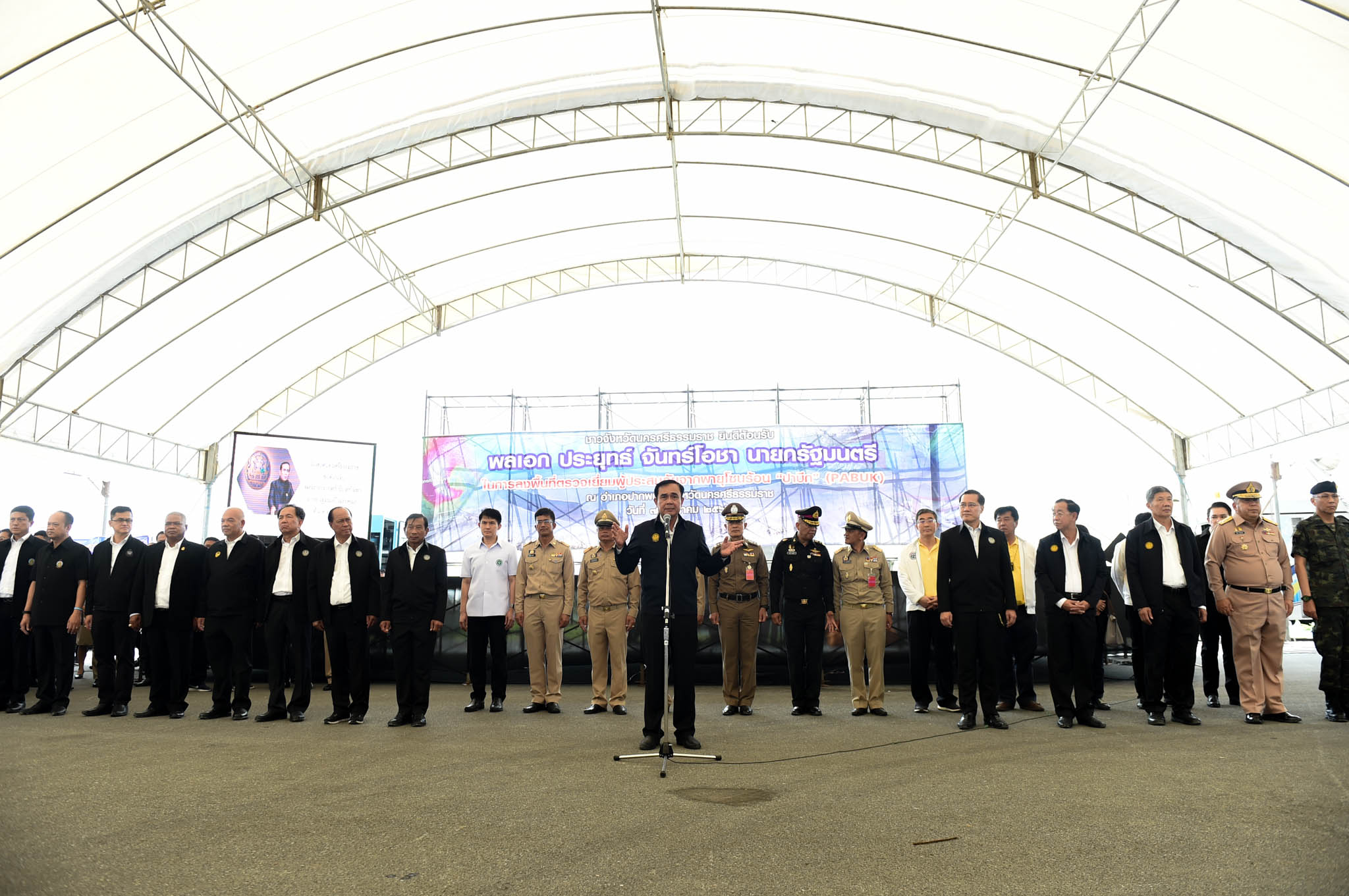 วันนี้ (7 ม.ค 62) เวลา 07.00 น. พลเอก ประยุทธ์ จันทร์โอชา นายกรัฐมนตรี พร้อมคณะประกอบด้วย พลเอก ฉัตรชัย สาริกัลยะ รองนายกรัฐมนตรี พลเอก อนุพงษ์ เผ่าจินดา รัฐมนตรีว่าการกระทรวงมหาดไทย นายวีระศักดิ์ โควสุรัตน์ รัฐมนตรีว่าการกระทรวงการท่องเที่ยวและกีฬา นายกฤษฎา บุญราช รัฐมนตรีว่าการกระทรวงเกษตรและสหกรณ์ นายอาคม เติมพิทยาไพสิฐ รัฐมนตรีว่าการกระทรวงคมนาคม พลเอก วิลาศ อรุณศรี เลขาธิการนายกรัฐมนตรี และผู้บริหารหน่วยงานที่เกี่ยวข้องเดินทางลงพื้นที่ตรวจเยี่ยมผู้ประสบภัยจากเหตุพายุโซนร้อนปาบึก ณ จังหวัดนครศรีธรรมราช นายกรัฐมนตรีได้กล่าวกับประชาชนที่มาให้การต้อนรับว่า รัฐบาลพร้อมให้การช่วยเหลือในทุก ๆ ด้าน พร้อมสั่งการให้หน่วยงานราชการในพื้นที่เร่งฟื้นฟูซ่อมแซมบ้านเรือน ถนน ทาง รวมถึงความเสียหายอื่น ๆ เพื่อบรรเทาความเดือดร้อนให้กับประชาชน โดยให้เร่งสำรวจความเสียหายให้แล้วเสร็จภายใน 15 วัน ซ่อมแซมระบบสาธารณูปโภคให้แล้วเสร็จภายใน 7 วัน และซ่อมแซมที่อยู่อาศัยโดยเฉพาะความเสียหายทั้งหลังให้แล้วเสร็จภายใน 1 เดือน