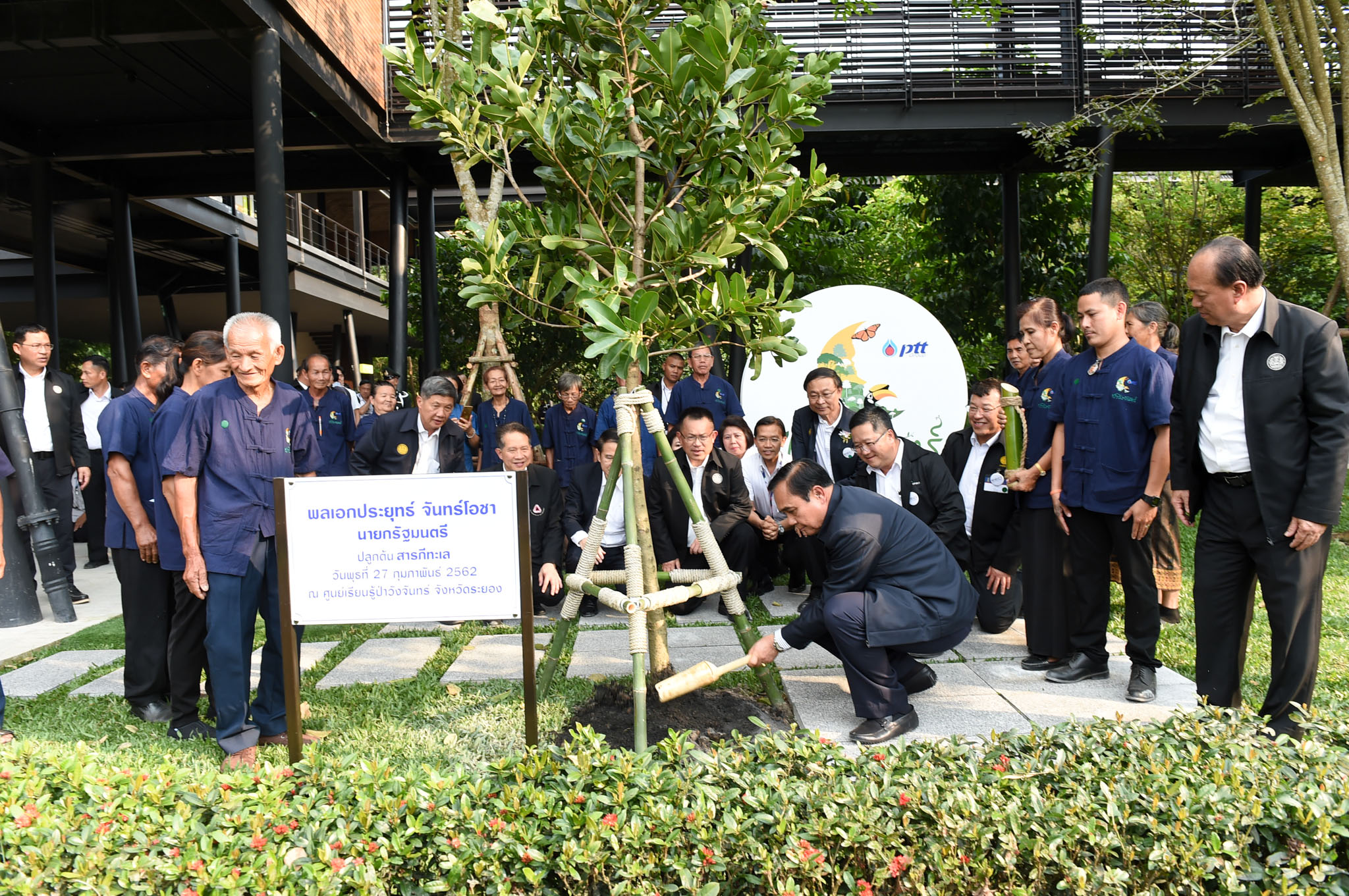 วันนี้(27 ก.พ. 62) เวลา 16.35 น. พลเอก วิลาศ อรุณศรี เลขาธิการนายกรัฐมนตรี ร่วมคณะนายกรัฐมนตรี เดินทางมายังศูนย์การเรียนรู้ป่าวังจันทร์ ตำบลป่ายุบใน อำเภอวังจันทร์ จังหวัดระยอง ซึ่งเป็นศูนย์รวมองค์ความรู้การดำเนินงานด้านการอนุรักษ์ทรัพยากรธรรมชาติและสิ่งแวดล้อมของ ปตท. และเยี่ยมชมนิทรรศการผลสัมฤทธิ์การดำเนินงานการปลูกและฟื้นฟูป่าที่สำคัญของ ปตท. ซึ่งเป็นศูนย์องค์ความรู้ที่ให้ความสำคัญกับการอนุรักษ์ทรัพยากรธรรมชาติและสิ่งแวดล้อม และการฟื้นฟูป่าเสื่อมโทรม ด้วยการปลูกป่าที่สามารถช่วยดูดซับก๊าชคาร์บอนไดออกไซด์ และปล่อยก๊าชออกซิเจน สร้างลมหายใจให้มนุษย์ 5.7 ล้านคนต่อปี โดย ปตท. ได้ตระหนักและเห็นความสำคัญของการฟื้นฟูป่า จึงได้รวบรวมองค์ความรู้และประสบการณ์จริงด้านการบริหารจัดการป่า จัดตั้ง “ศูนย์เรียนรู้ป่าวังจันทร์" ขึ้น ซึ่งมีที่ตั้งบริเวณ EECi เป็นแหล่งเรียนรู้ด้านจัดการป่าอย่างครบวงจร เพื่อการอนุรักษ์ทรัพยากรธรรมชาติและสิ่งแวดล้อมอย่างยั่งยืน และเป็นพื้นที่ปลูกป่านำร่องที่เข้าร่วมโครงการลดก๊าชเรือนกระจกภาคสมัครใจ สาขาป่าไม้ รวมถึงเป็นแหล่งท่องเที่ยวเชิงนิเวศ