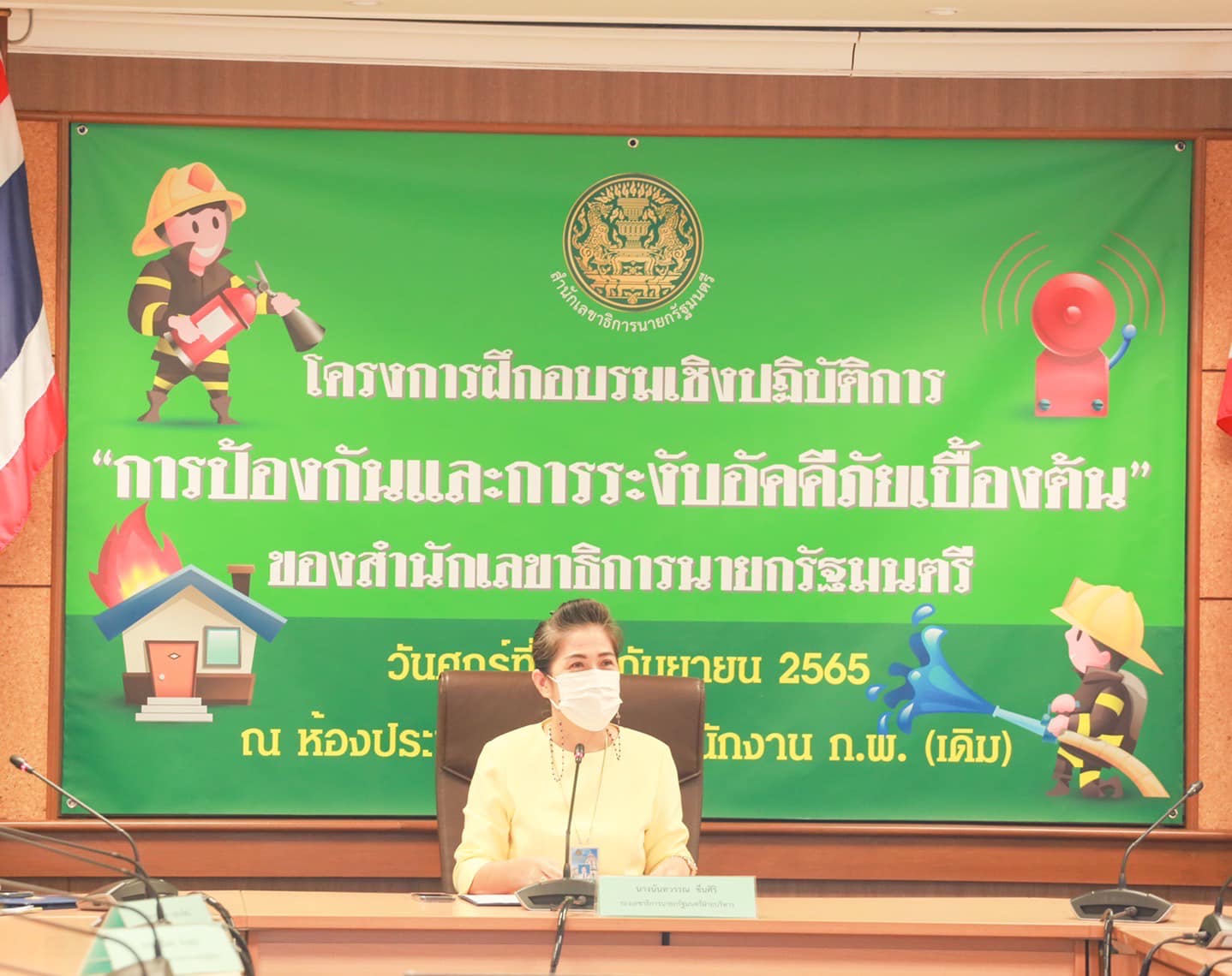 วันนี้ (16 กันยายน 2565) เวลา 09.00 น. นางนันทวรรณ ชื่นศิริ รองเลขาธิการนายกรัฐมนตรีฝ่ายบริหาร ให้เกียรติเป็นประธานเปิดโครงการฝึกอบรมเชิงปฏิบัติการ “การป้องกันและระงับอัคคีภัยเบื้องต้น" ของสำนักเลขาธิการนายกรัฐมนตรี โดยมี วิทยากรจากสำนักป้องกันและบรรเทาสาธารณภัย กรุงเทพมหานคร เป็นผู้บรรยายความรู้เกี่ยวกับการป้องกันและระงับอัคคีภัย แก่บุคลากรของสำนักเลขาธิการนายกรัฐมนตรี เจ้าหน้าที่ตำรวจ และเจ้าหน้าที่ธนาคารต่าง ๆ ภายในทำเนียบรัฐบาล โดยมีกิจกรรมฝึกซ้อมการอพยพเมื่อเกิดอัคคีภัย รวมทั้งการสาธิตและฝึกปฏิบัติการใช้อุปกรณ์ดับเพลิงเคมีในการเข้าผจญเพลิง โดยวัตถุประสงค์โครงการ ฯ จัดขึ้นเพื่อสร้างความรู้ ความเข้าใจ และเสริมสร้างทักษะในด้านการป้องกันและระงับอัคคีภัยเบื้องต้นอย่างปลอดภัย ทั้งนี้ การฝึกอบรม ฯ ดังกล่าว จัดขึ้น ณ ห้องประชุม 3 ชั้น 3 สำนักงาน ก.พ. (เดิม)