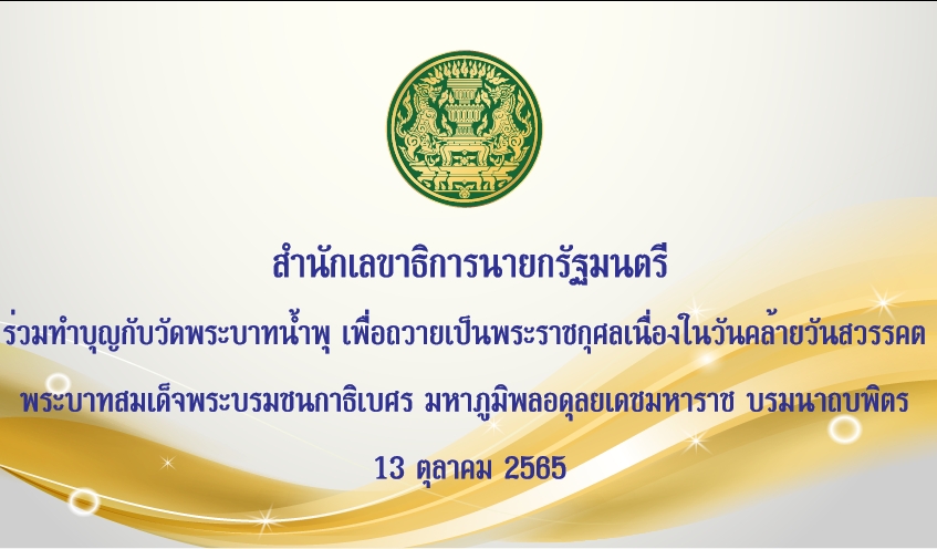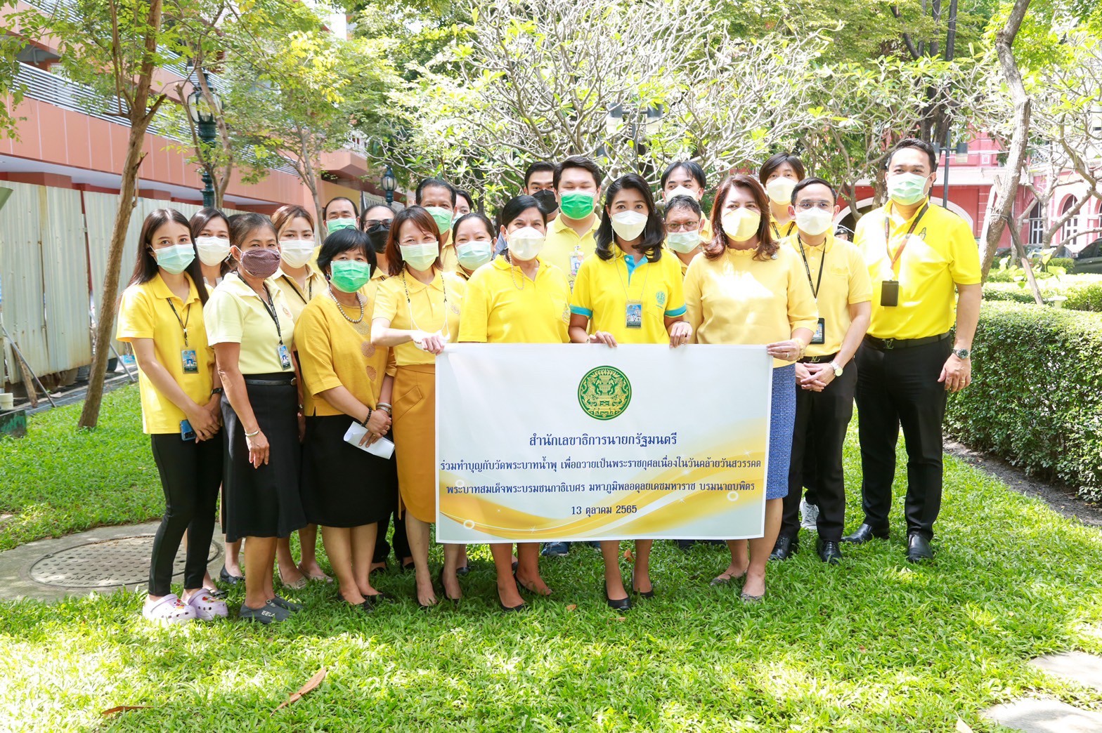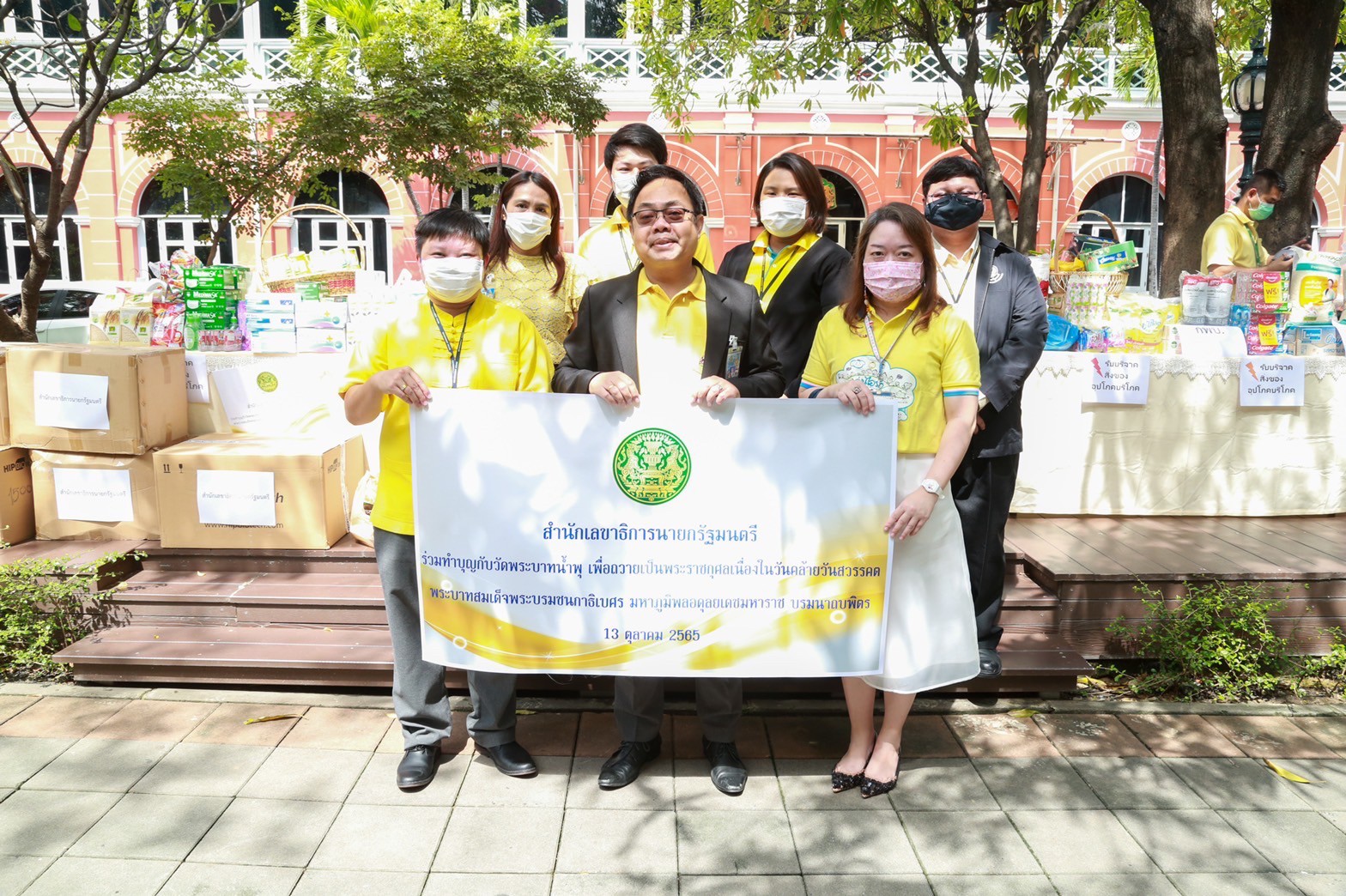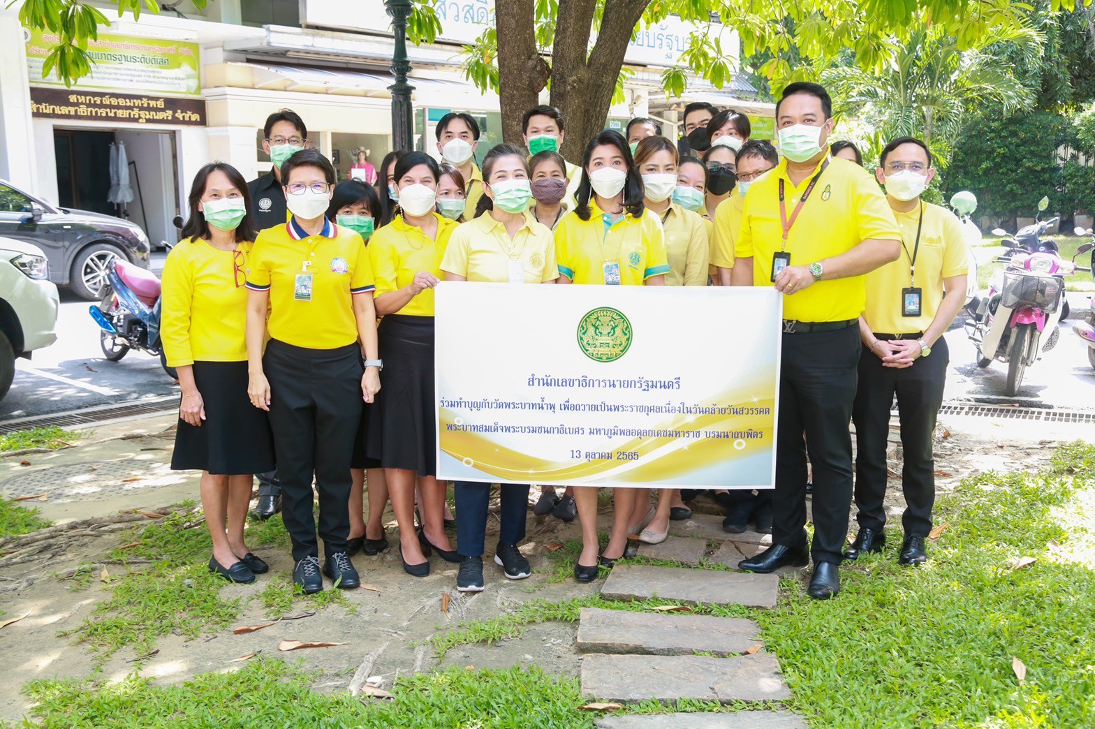 วันนี้ (12 ตุลาคม 2565) เวลา 10.30 น. ณ บริเวณลานนันทนาการสวนหย่อมน้ำพุ หน้าอาคาร 41 ทำเนียบรัฐบาล นางนิชา หิรัญบูรณะ ธุวธรรม รองเลขาธิการนายกรัฐมนตรีฝ่ายบริหาร นำคณะผู้บริหาร และบุคลากรสำนักเลขาธิการนายกรัฐมนตรีร่วมกิจกรรมทำบุญกับวัดพระบาทน้ำพุ เพื่อถวายเป็นพระราชกุศลเนื่องในวันคล้ายวันสวรรคต พระบาทสมเด็จพระบรมชนกาธิเบศร มหาภูมิพลอดุลยเดชมหาราช บรมนาถบพิตร 13 ตุลาคม 2565 ในการนี้ นายดิสทัต โหตระกิตย์เลขาธิการนายกรัฐมนตรี พร้อมด้วยคณะผู้บริหาร และบุคลากรสำนักเลขาธิการนายกรัฐมนตรี ร่วมทำบุญบริจาคหน้ากากอนามัย N95 จำนวน 5,000 ชิ้น ชุดป้องกันเชื้อโรค PPE จำนวน 250 ชุด เครื่องอุปโภคบริโภค และเงินรับบริจาค โดย นางนันทวรรณ ชื่นศิริ รองเลขาธิการนายกรัฐมนตรีฝ่ายบริหาร เป็นผู้แทนนำสิ่งของและเงินบริจาคไปถวายแด่ พระราชวิสุทธิประชานาถ (เจ้าคุณอลงกต) เจ้าอาวาสวัดพระบาทน้ำพุ ณ สำนักงาน ก.พ. จังหวัดนนทบุรี