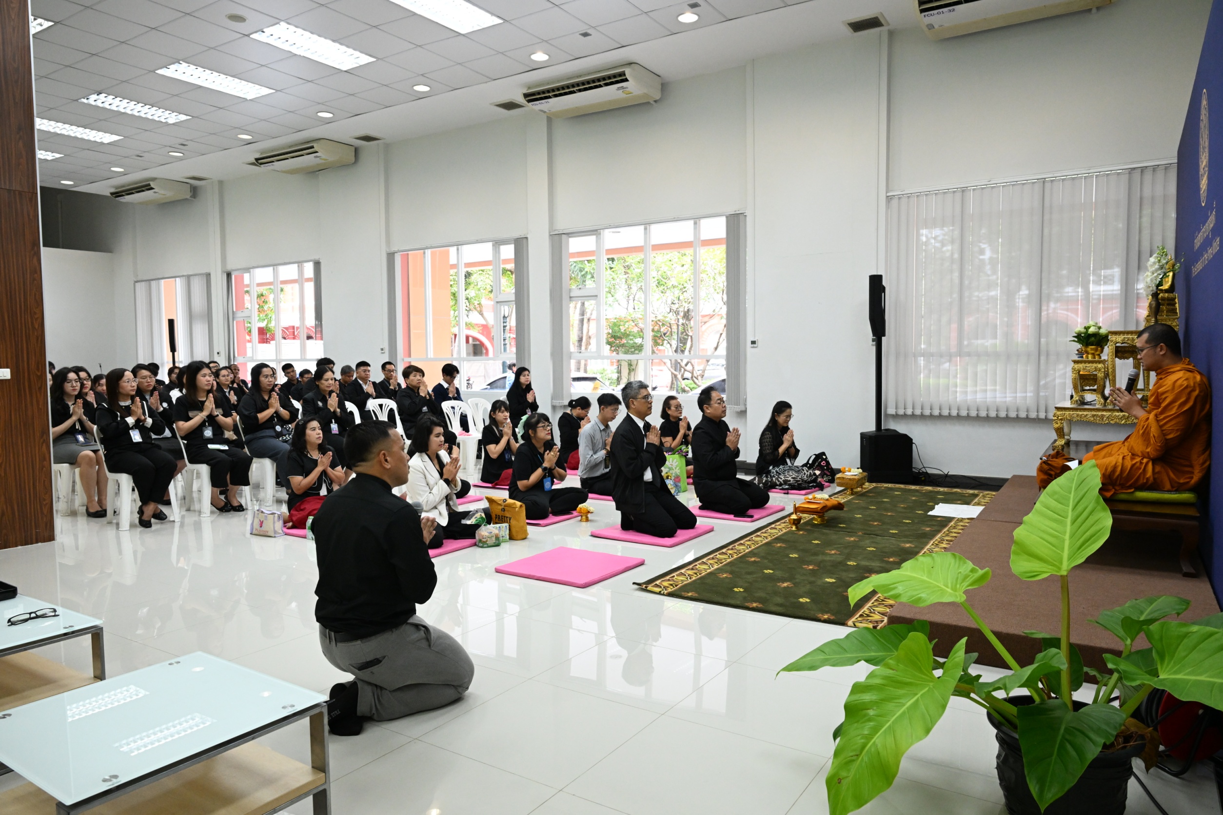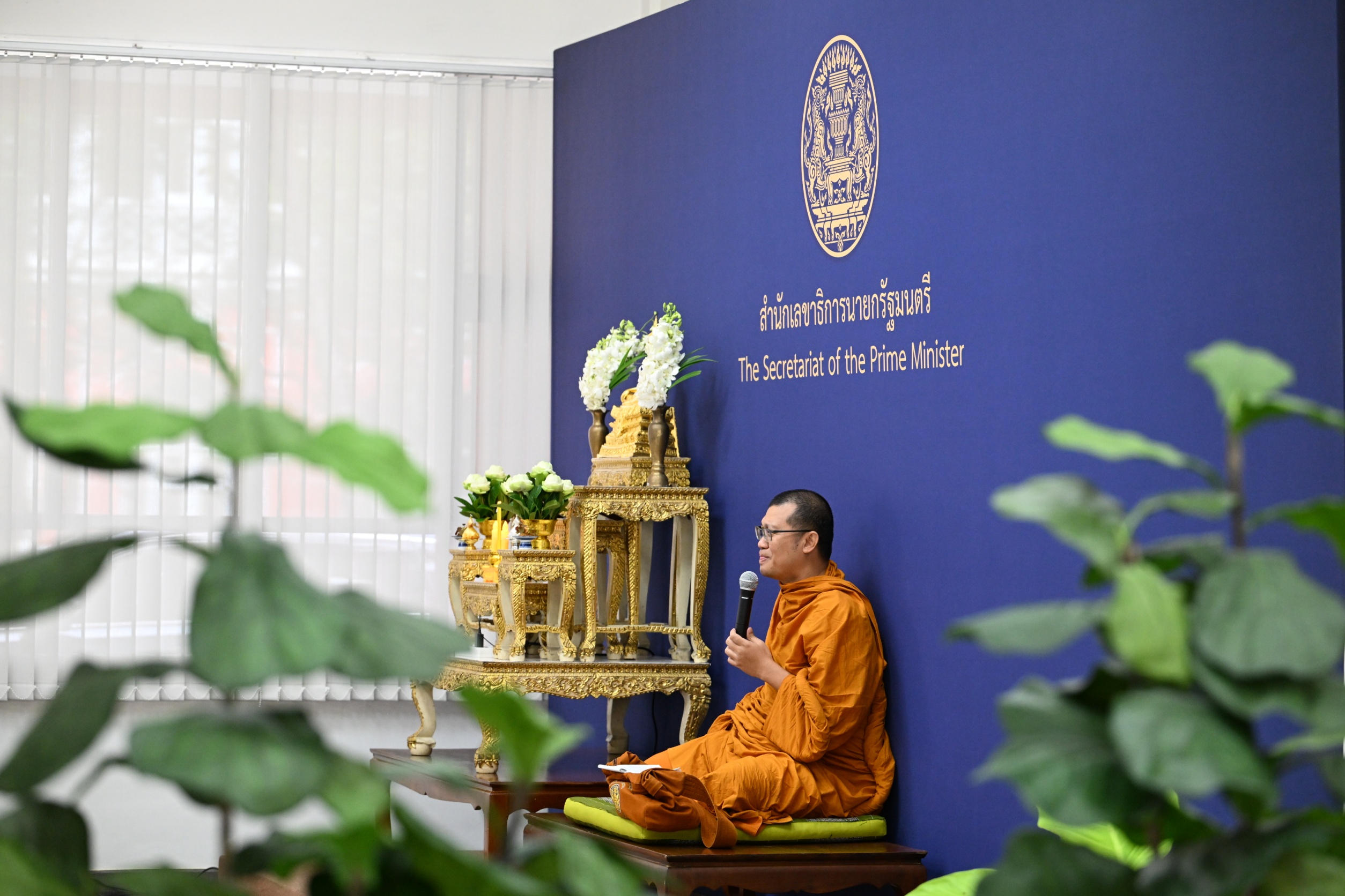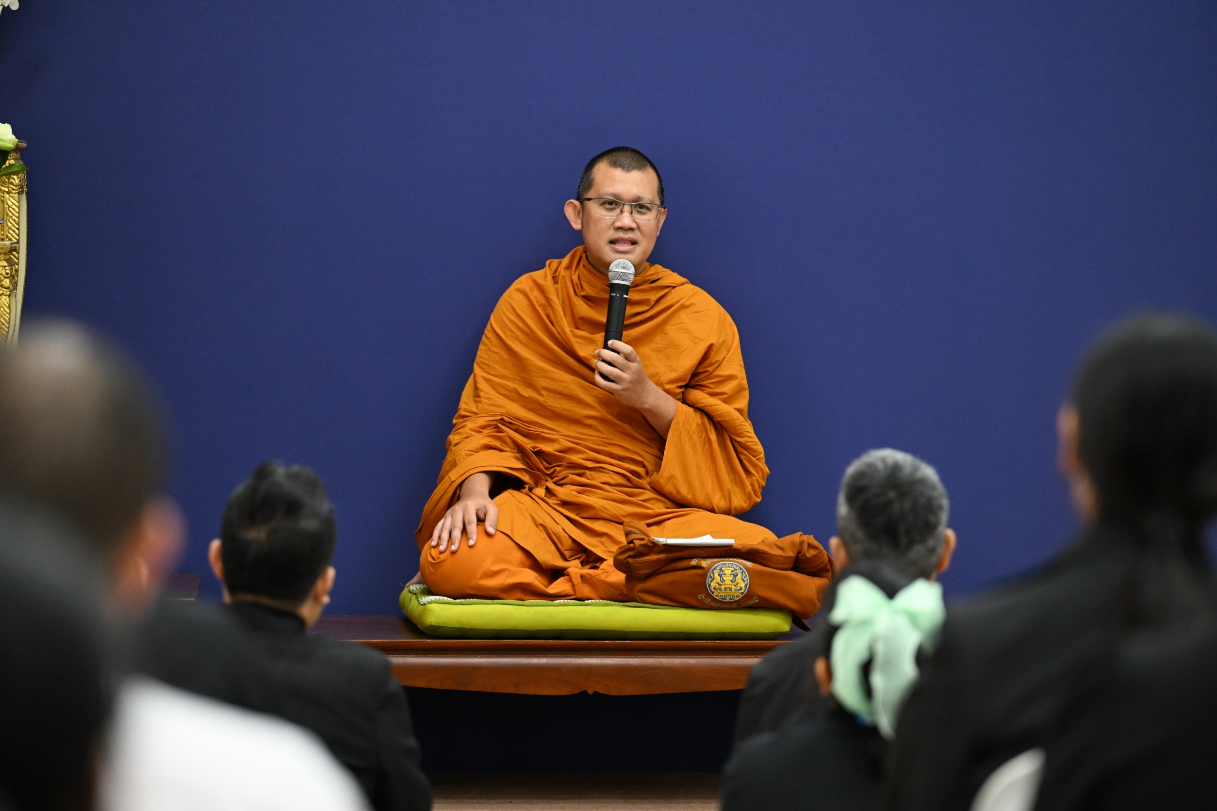 พิธีได้รับความเมตตาจากพระครูปลัด นนท์ กิตฺติปญฺโญ เจ้าอาวาสวัดโพธิ์เผือก ตำบลบางกรวย อำเภอบางกรวย จังหวัดนนทบุรี บรรยายธรรม ในหัวข้อ “สุข จบที่ใจ ใช่ที่อื่น” เชื่อมโยงหลักสัมมาทิฐิใน “มรรคมีองค์แปด” และสัมมาปฏิบัติ เป็นแนวทางขัดเกลาจิตใจและประพฤติปฏิบัติหน้าที่ราชการด้วยความถูกต้อง โปร่งใส และมีสติ ต่อจากนั้นผู้ร่วมพิธีพร้อมใจกันเจริญจิตภาวนาเพื่อน้อมอุทิศถวายเป็นพระราชกุศล