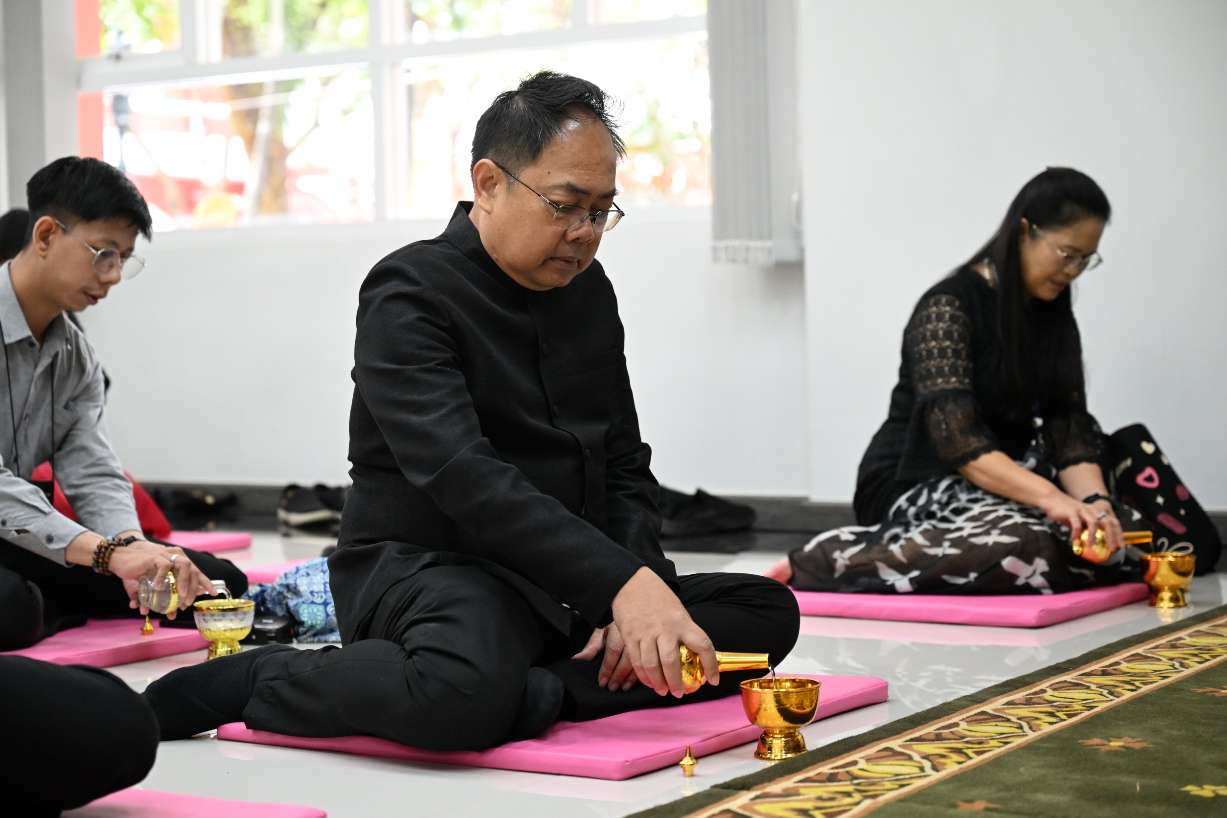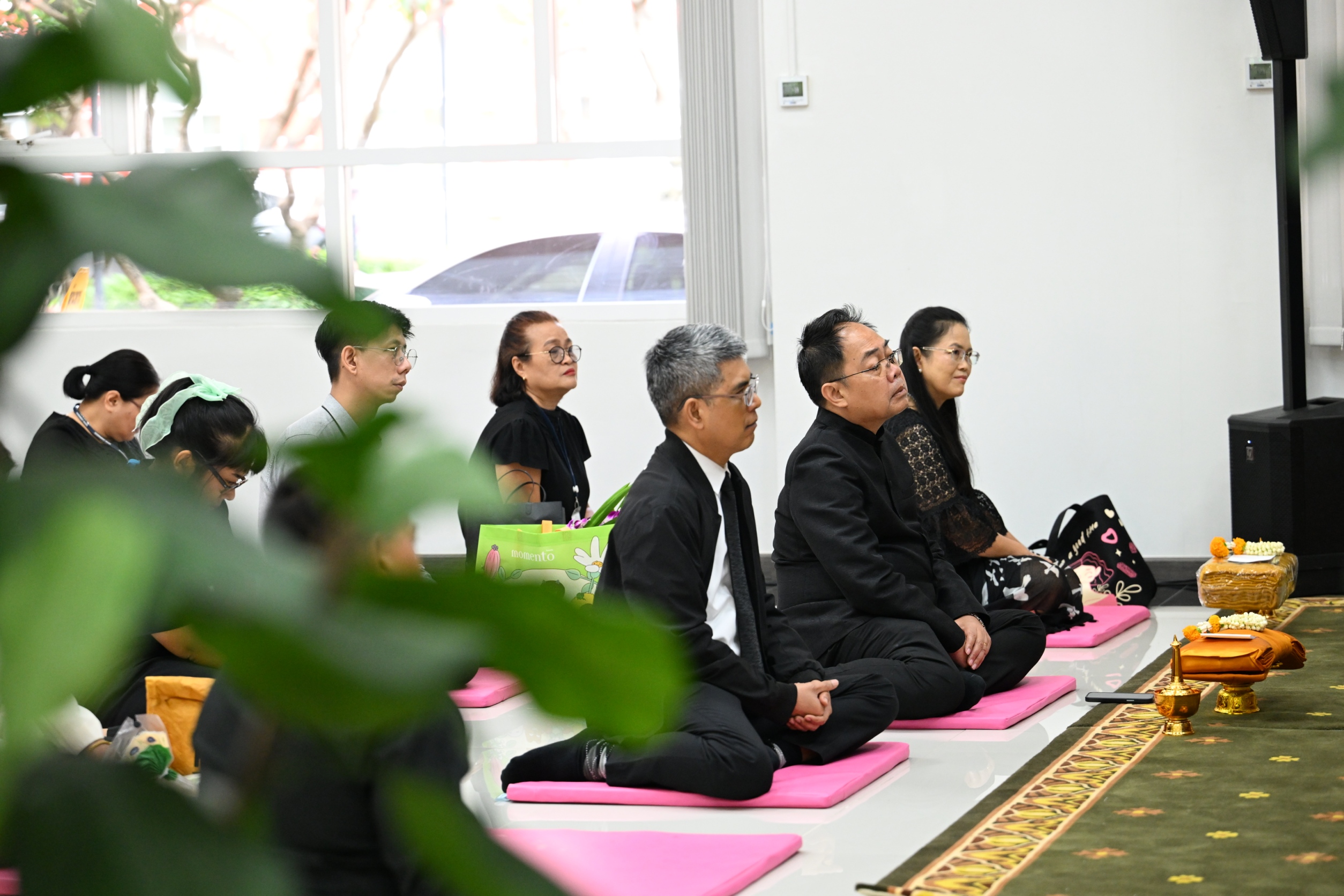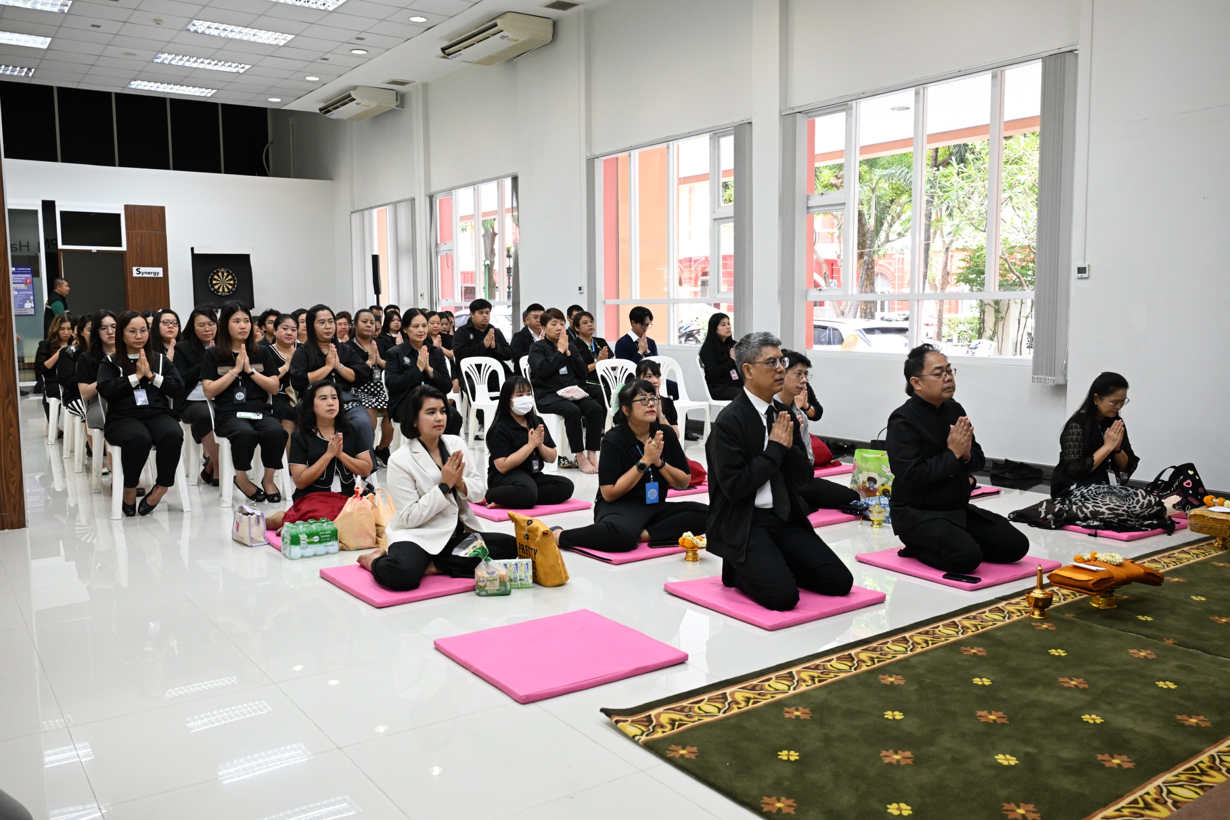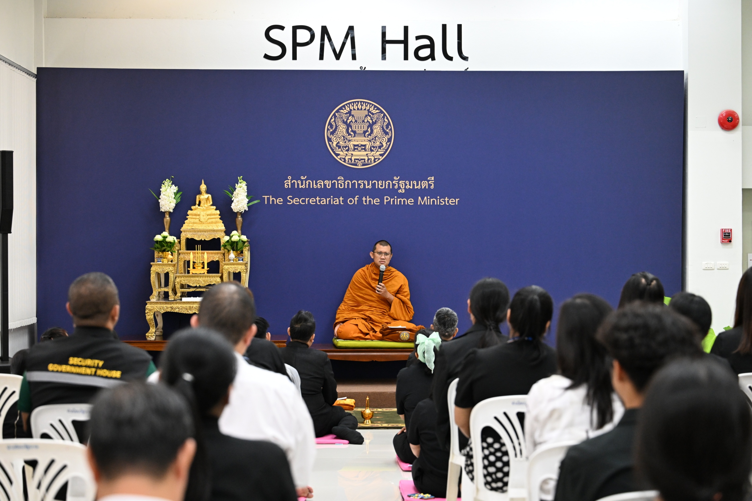 พิธีได้รับความเมตตาจากพระครูปลัด นนท์ กิตฺติปญฺโญ เจ้าอาวาสวัดโพธิ์เผือก ตำบลบางกรวย อำเภอบางกรวย จังหวัดนนทบุรี บรรยายธรรม ในหัวข้อ “สุข จบที่ใจ ใช่ที่อื่น” เชื่อมโยงหลักสัมมาทิฐิใน “มรรคมีองค์แปด” และสัมมาปฏิบัติ เป็นแนวทางขัดเกลาจิตใจและประพฤติปฏิบัติหน้าที่ราชการด้วยความถูกต้อง โปร่งใส และมีสติ ต่อจากนั้นผู้ร่วมพิธีพร้อมใจกันเจริญจิตภาวนาเพื่อน้อมอุทิศถวายเป็นพระราชกุศล