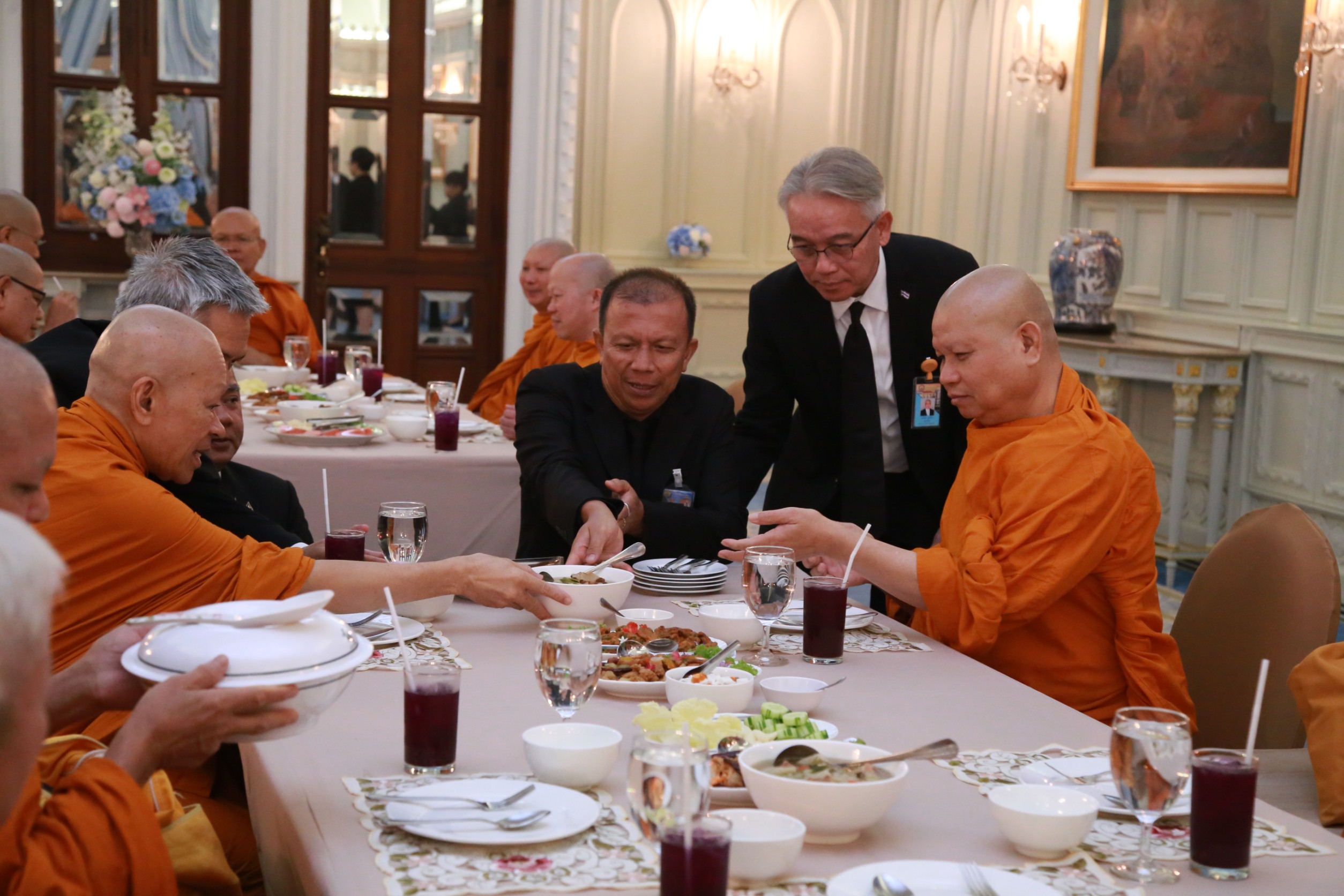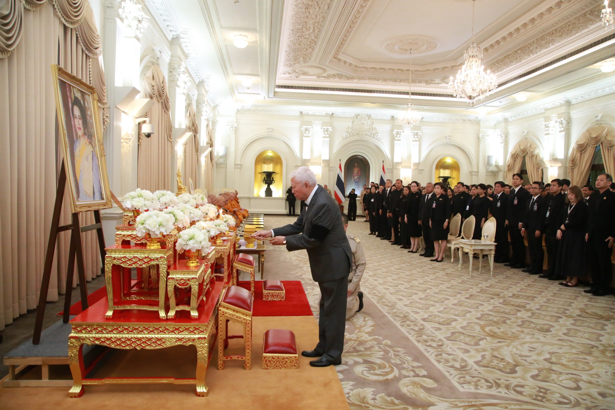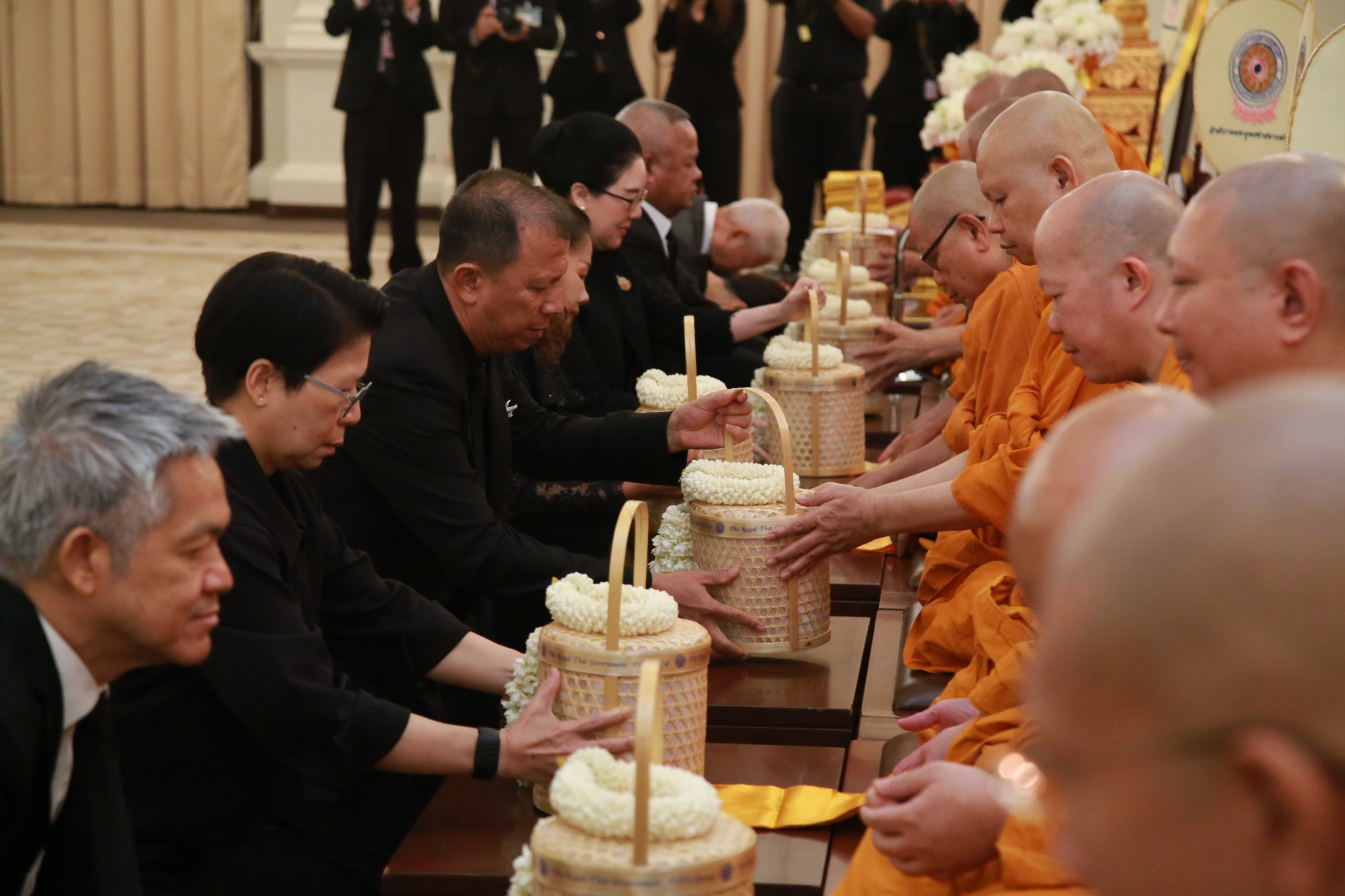 จากนั้น นายชยันต์ เมืองสง รองเลขาธิการนายกรัฐมนตรีฝ่ายบริหาร นางชนิดา เกษมศุข รองเลขาธิการนายกรัฐมนตรีฝ่ายบริหาร ได้ร่วมถวายไทยธรรมแด่พระสงฆ์ เสร็จแล้วร่วมเจริญจิตตภาวนา เพื่อน้อมรำลึกในพระมหากรุณาธิคุณอันหาที่สุดมิได้ และอุทิศถวายเป็นพระราชกุศล