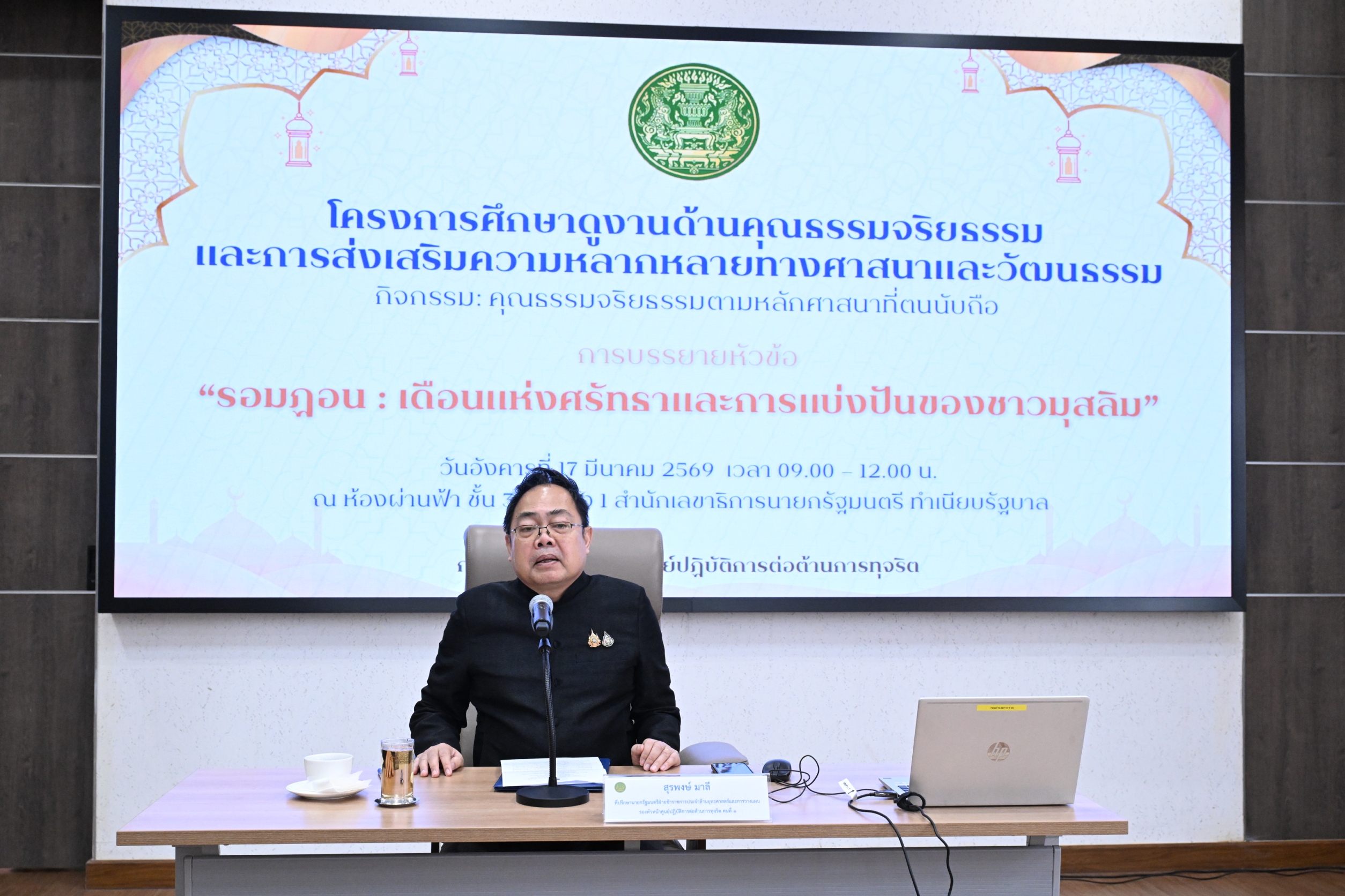 นายสุรพงษ์ มาลี ที่ปรึกษานายกรัฐมนตรีข้าราชการประจำด้านยุทธศาสตร์และการวางแผน เป็นประธานในพิธีเปิดโครงการศึกษาดูงานด้านคุณธรรมจริยธรรมและการส่งเสริมความหลากหลายทางศาสนา ภายใต้กิจกรรมคุณธรรมจริยธรรมตามหลักศาสนาที่ตนนับถือ พร้อมการบรรยายในหัวข้อ “รอมฎอน : เดือนแห่งศรัทธาและการแบ่งปันของชาวมุสลิม”